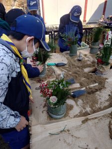 2023年12月30日 門松作り 12月29日ビーバー隊とカブ隊は年末の江越礼太先生のお墓掃除のあと、団野営で門松作りをしました。 2023年12月30日 | Posted in カブ隊, ビーバー隊, 写真集, 有田第1団, 未分類 | | Comments Closed 関連記事 スカウトの日にちなんで空き缶拾い 9月カブの隊集会 8月のカブ隊キャンプ 平和の鐘 ビーバー・カブ隊は海水浴を楽しみました < 江越先生のお墓掃除 初日の出登山 >